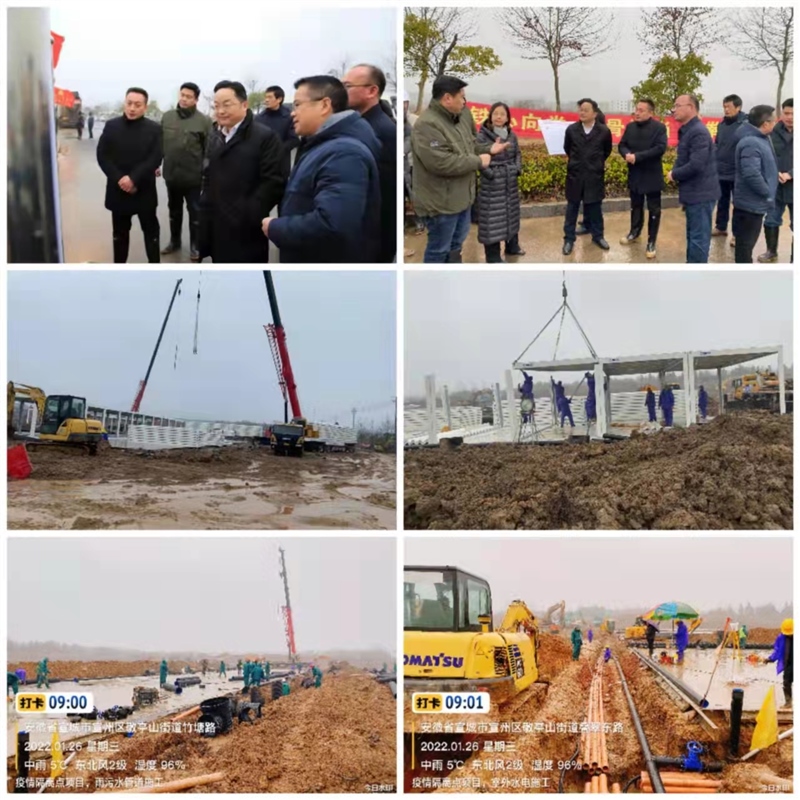 截止1月26日,現(xiàn)場已完成10000平方米混凝土硬化,雨污水管道、室外水電管道安裝進(jìn)展迅速,集裝箱板房開始拼裝。天氣惡劣、工期緊迫,一線人員努力克服各種困難和障礙,迎難而上。1月25日下午,區(qū)政府召開宣州區(qū)新冠肺炎疫情防控工作專題會議,審定了隔離點(diǎn)項目方案,明確了相關(guān)事項,會議對施工進(jìn)度和現(xiàn)場管理給予了充分的肯定,同時也要求在嚴(yán)把工程質(zhì)量關(guān)和隔離點(diǎn)各項要求的基礎(chǔ)上,倒排工期,加快施工,確保早日交付使用。